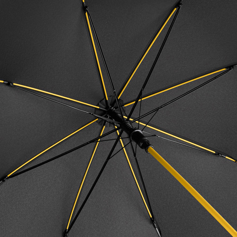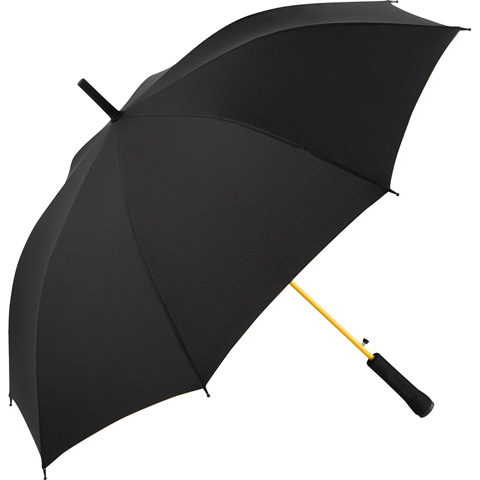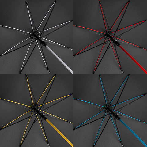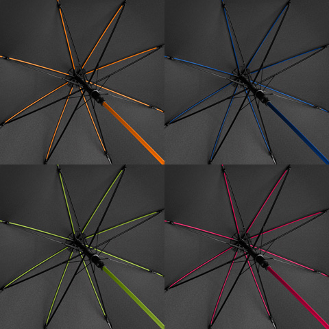 Attraktiver Automatik-Stockschirm mit farbigem Stock und farbigen Fiberglasschienen. Hohe Gestell-Flexibilität durch Windproof-Featuers.