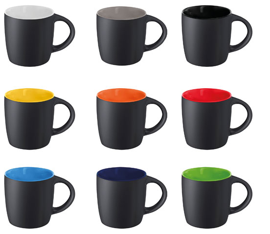 Werbeartikel Steinzeugtasse mit Ihrem Firmenlogo bedruckt. Schöne, mattschwarze Erscheinung mit glänzender, farbiger Innenglasur.
