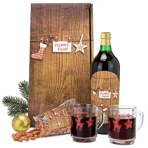Ein kleiner eigener Weihnachtsmarkt mit oder ohne Logodruck. Glühwein (1 l L) 2 Glühweintassen und dragierte Erdnüsse