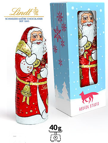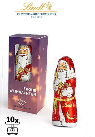 Individuell mit Ihrem Logo gestaltete Werbekartonage ein süsser Gruß zur Adventszeit, ein Lindt Nikolaus aus Alpenmilch Schokolade. In drei Größen 10g, 40g und 70 g.