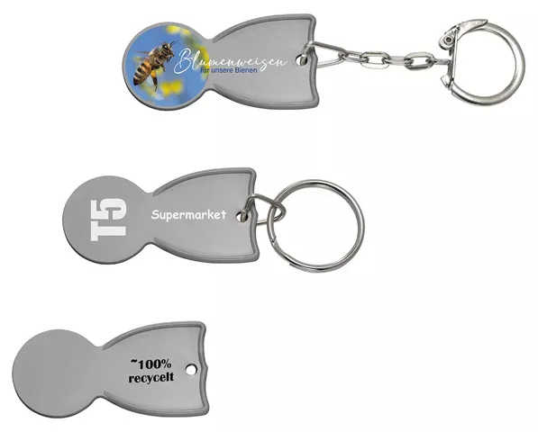 Einkaufswagenlöser aus 100% recyceltem Kunststoff, mit Kette und Schlüsselring oder auch ohne.